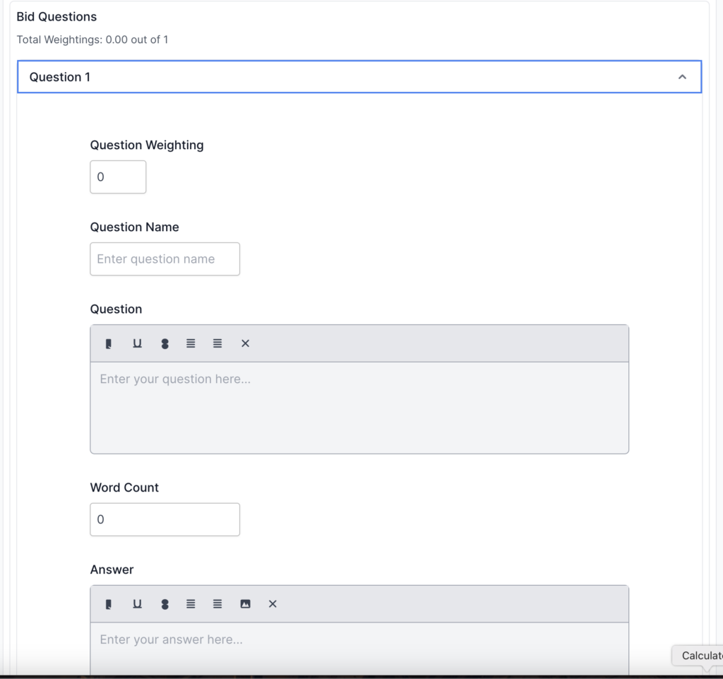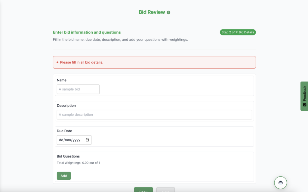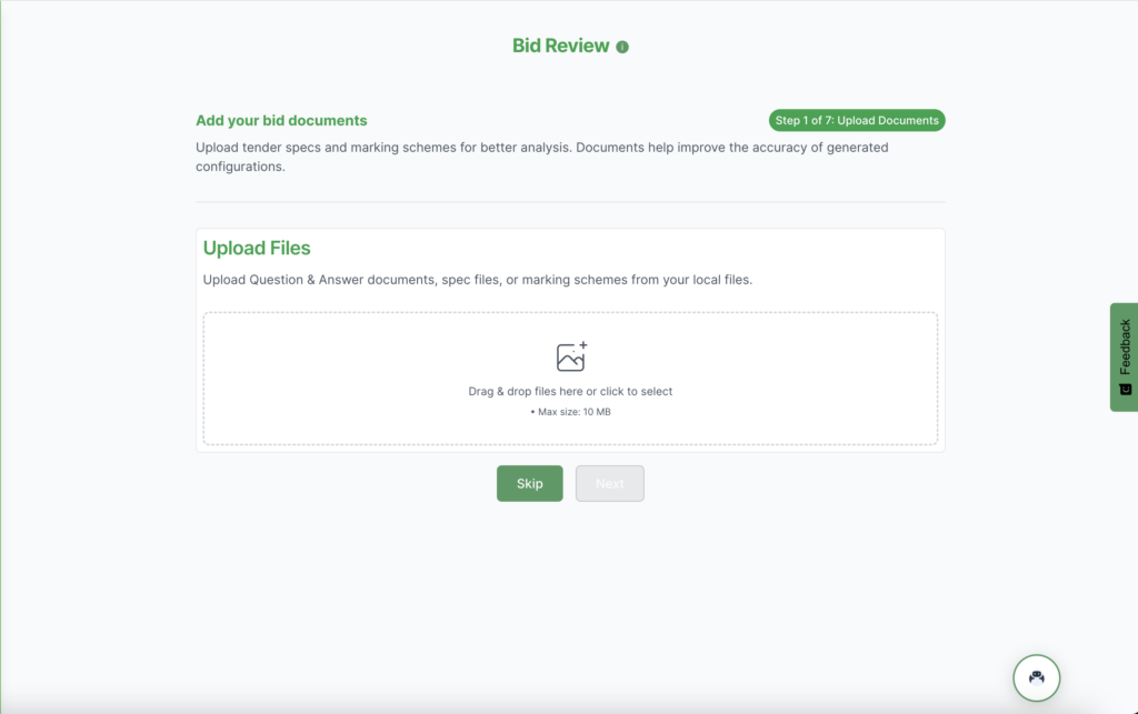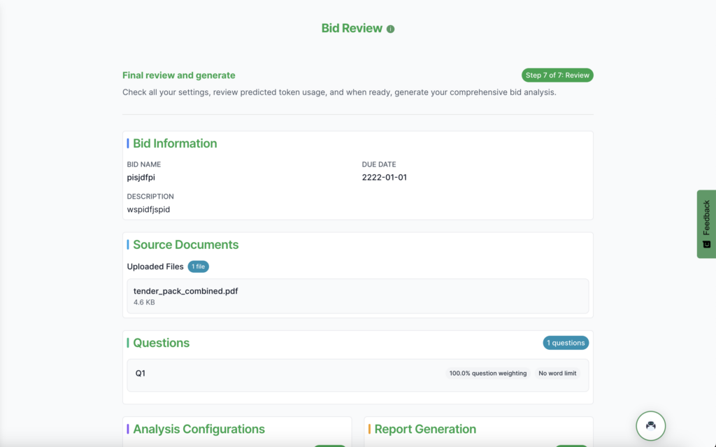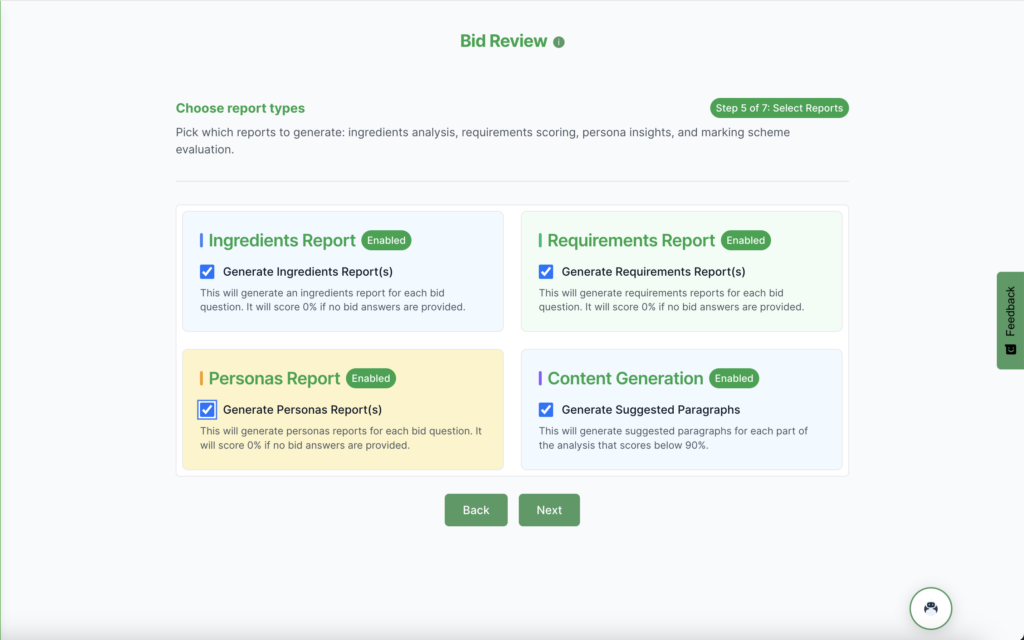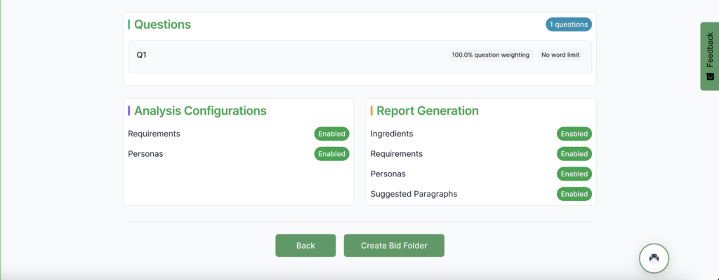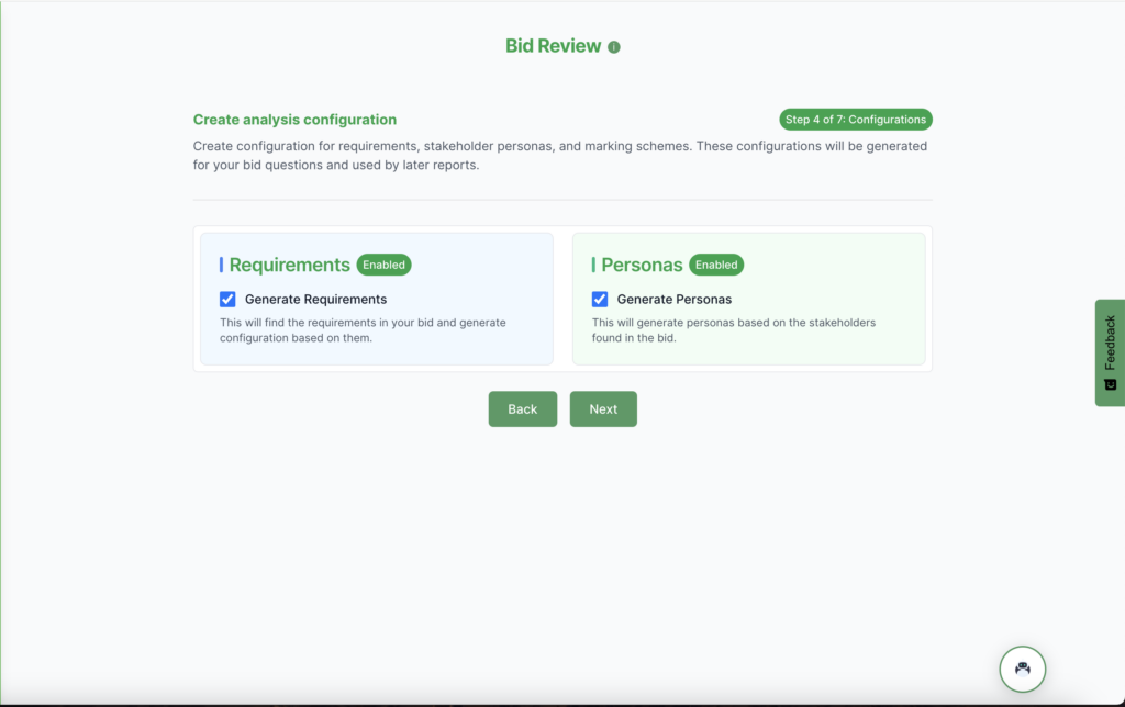 When selected, the platform will automatically configure requirements and personas for each question. This ensures the bid is correctly set up to be analysed.