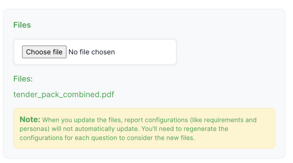 • Attached Files: Upload files associated with the bid. Note that adding or updating files will not automatically regenerate the report configuration. To apply the latest changes, you’ll need to update each question report configuration manually within the report page