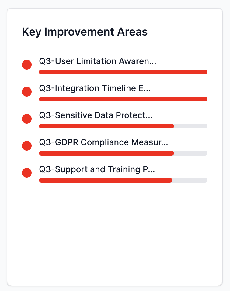 On the bid page, after bid questions are added and reports are run, you can see which questions and areas offer the greatest potential to improve your overall score. The chart highlights the top five areas with the biggest impact potential, calculated using a combination of bid question weighting, report weighting, subcategory weighting, and current scores. The redder an area appears, the greater its potential for improvement. Focusing on these will have the greatest impact on your overall score.
