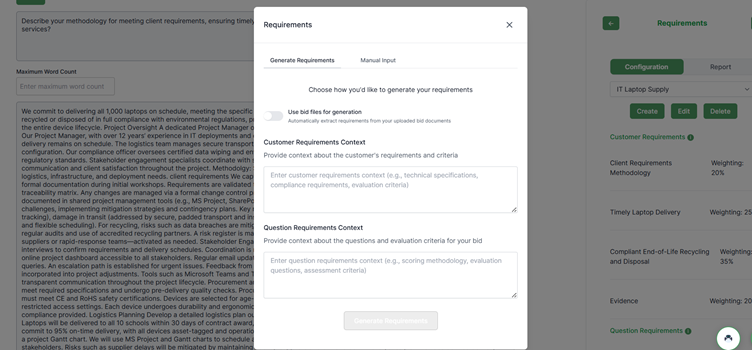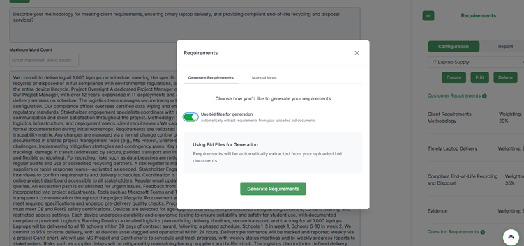 In most cases, you should simply click the white circle next to “Use the bid files for generation” to allow the system to automatically generate the requirements from your uploaded documents.