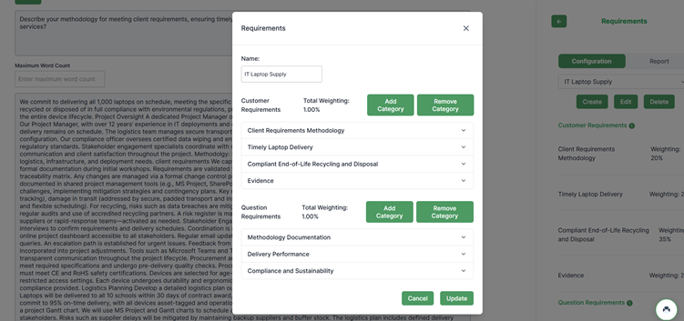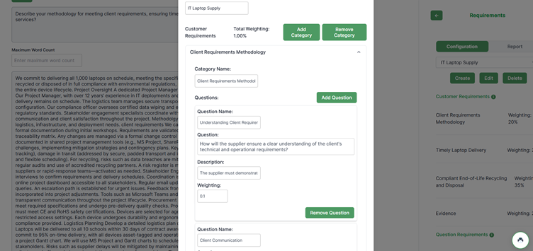 Fill in all required fields, ensuring that the total weighting for the Customer Requirements Category equals 1 before saving.