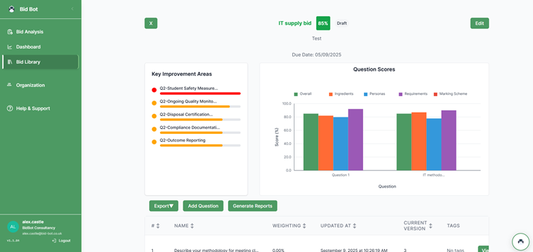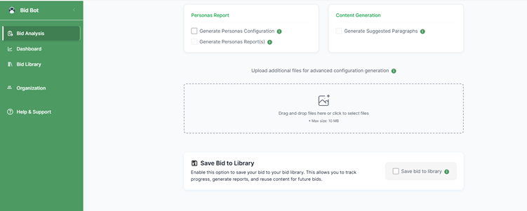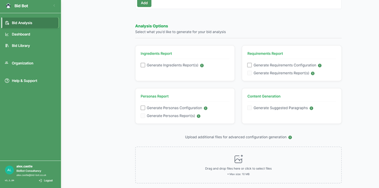 Selecting all options ensures the platform fully analyses your bid against the specification, configures requirements and personas, and generates all relevant reports.