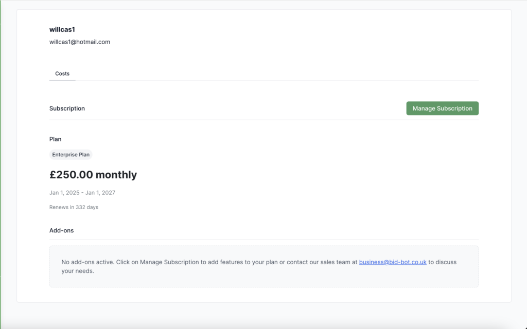 You can upgrade, downgrade, renew, or cancel your subscription as needed by contacting business@bid-bot.co.uk or by clicking “Managing Subscription”.
