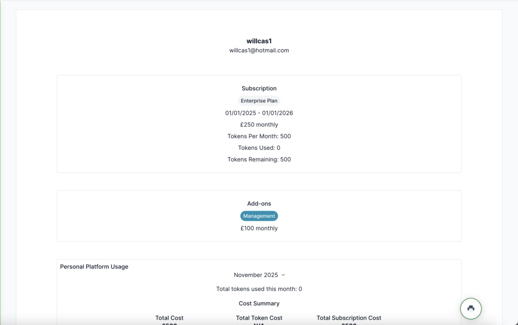The Profile page allows you to view and manage your user profile, subscription information, token usage, and billing details. This guide explains how to use profile management features.