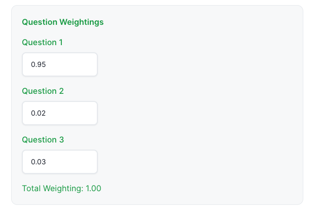 Question Weightings determine the importance of each question in your bid. Unlike Report Weightings (which control how different report types contribute to scoring), Question Weightings determine how much each question contributes to your overall bid score. This guide explains what question weightings are, how to set them, and why they matter.