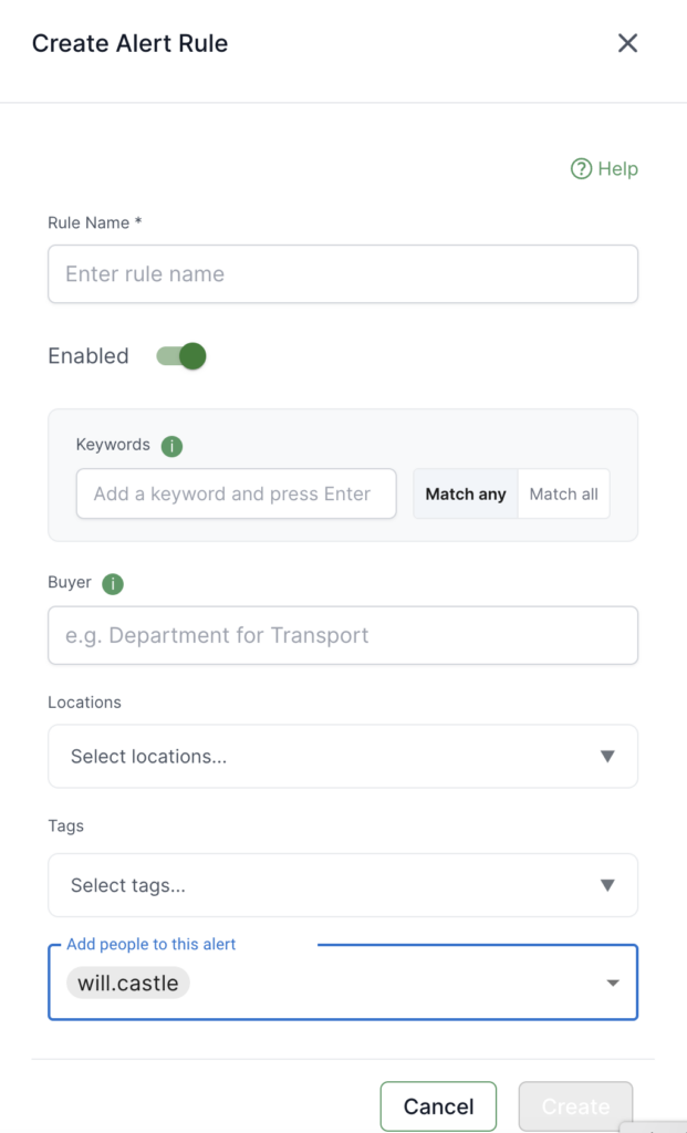 You can also configure tender alerts to notify you of any new tenders that have come out today. To do this, click on the “Alerts” tab at the top of the pag,e then click on the “Create Alert Rule” button to open up the alert configuration pop-up.