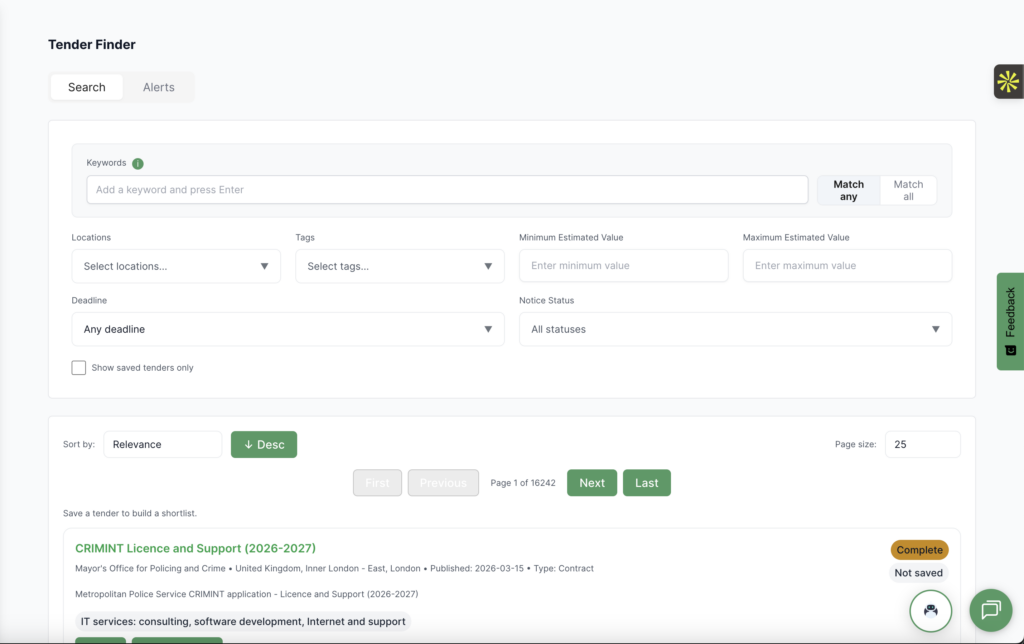 Tender Finder is a new page accessible via the sidebar. Here, the customer can filter tenders by amount, date, location, tags, notice types, and notice statuses to find the tenders they want to go for. Customers can save these tenders to come back to them later. We currently collect tenders from three places Contracts Finder, Public Contracts Scotland and Find a Tender. We collect information on tenders spanning back the last 25 years. With new tenders being added every day.